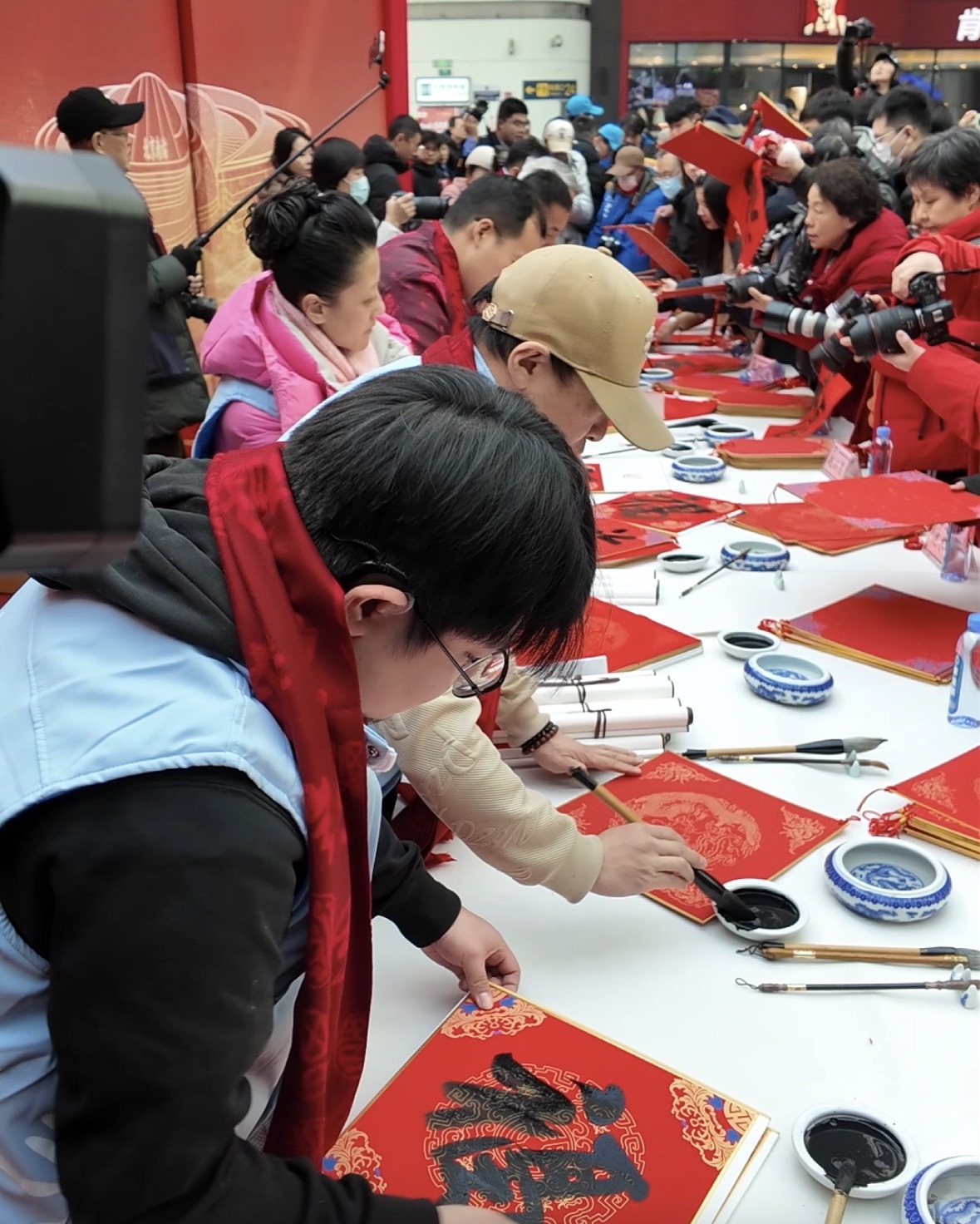 “旅途賀新春、溫暖回家路”春運送溫暖文明實踐活動在北京南站候車大廳上演。書法家們為旅客書寫福字。中國經濟網記者鞠然/攝