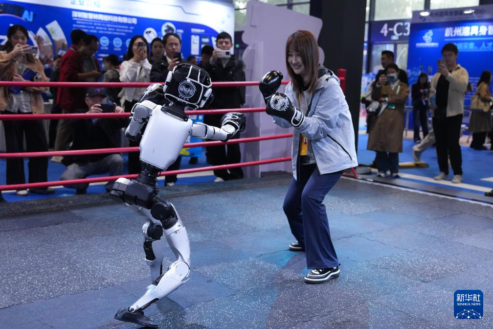 11月6日,一名工作人員與一款松延動力仿生機器人互動。這款自主研發的仿生機器人采用高精密執行器,結合仿生人本體與控制算法,可實時識別并模仿互動對象的各種面部表情。新華社記者趙宇思攝