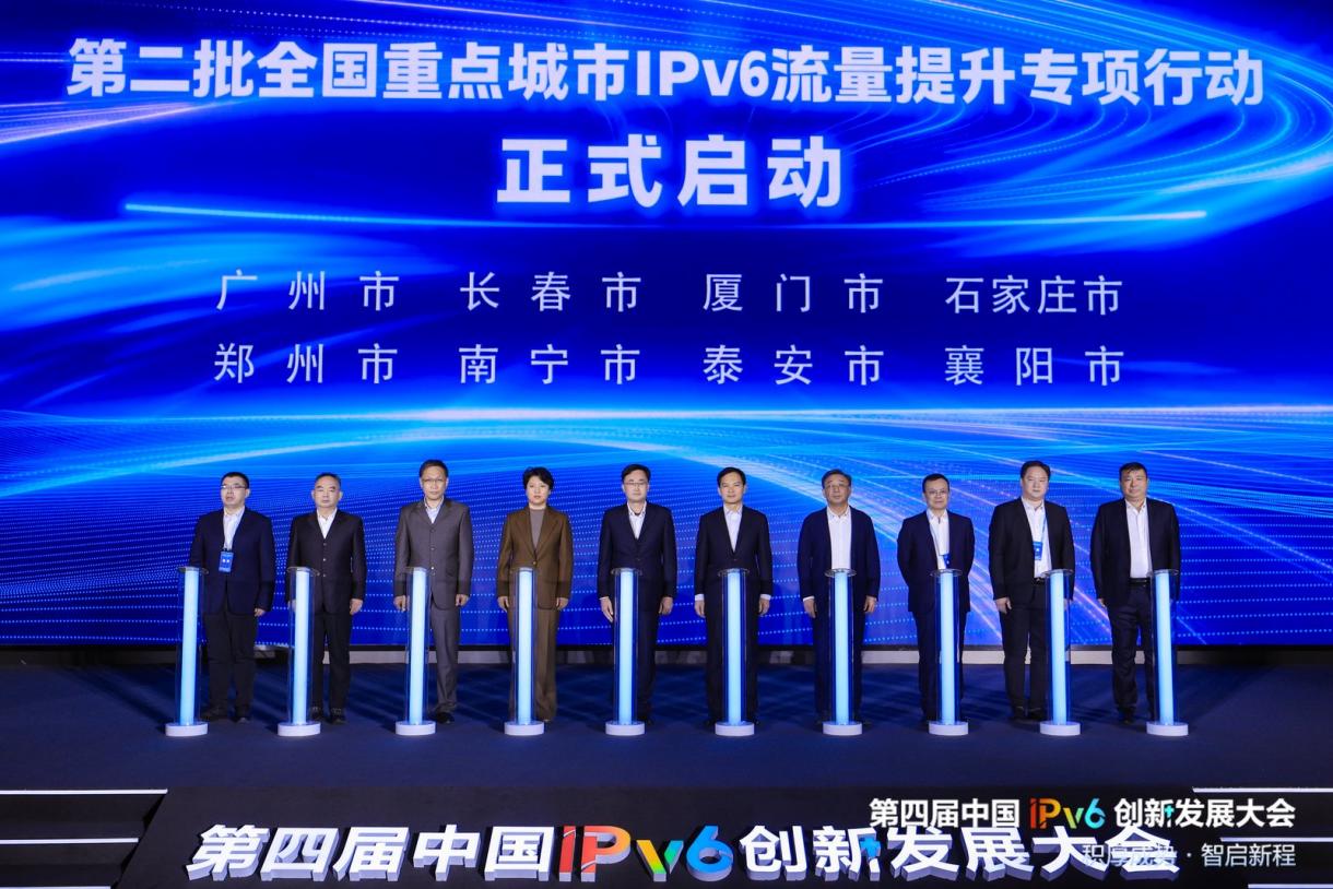 成果發布環節,與會各方共同見證了中央網信辦、工業和信息化部組織開展“全國重點城市IPv6流量提升專項行動”的經驗和成果,8個重點城市固定網絡IPv6流量占比同比增長63.14%,移動網絡IPv6流量平均占比同比增長12.37%。中央網信辦信息化發展局、工業和信息化部信息通信發展司及第二批8個重點城市相關領導,共同啟動“第二批全國重點城市IPv6流量提升專項行動”,深化關鍵環節升級改造,帶動全國IPv6發展水平再上新臺階。會上還發布了工業和信息化部、中央網信辦組織開展“網絡去NAT”專項工作的階段性成果:9個試點地區基礎電信企業自有環境固定寬帶用戶IPv6連通率達97.52%,試點地區NAT44設備容量全面實現零增長。后續,相關部門將在試點經驗基礎上,在全國范圍內進一步開展“網絡去NAT”專項工作,持續推動網絡和應用的IPv6演進升級。