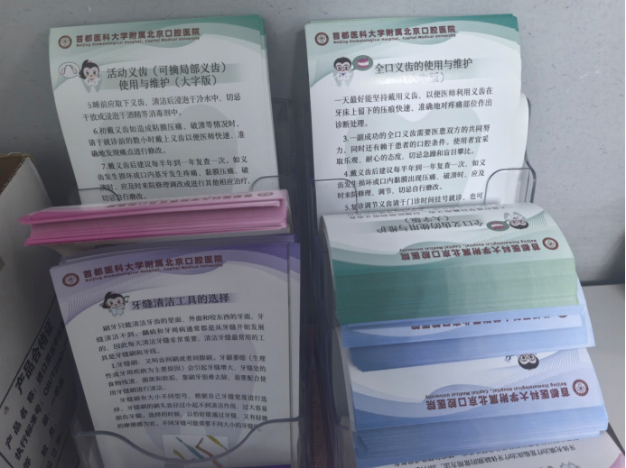 記者走進北京口腔醫院門診樓,綠色的“老年咨詢臺”標示映入眼簾。老年咨詢臺正前方走20米,左手邊便是老年口腔病科。順著黃色地標徑直走約30米,便到達分診臺。上午的分診臺前,是患者最多的時候,詢問聲和指引聲交織,忙而有序。分診臺一角的老花鏡和大字版宣教彩頁引人矚目。護士告訴記者,這是為老年患者特意準備的。“科室建的時間長,我們也準備搬新院了,雖然地方有點局促,但該有的硬件都有。”