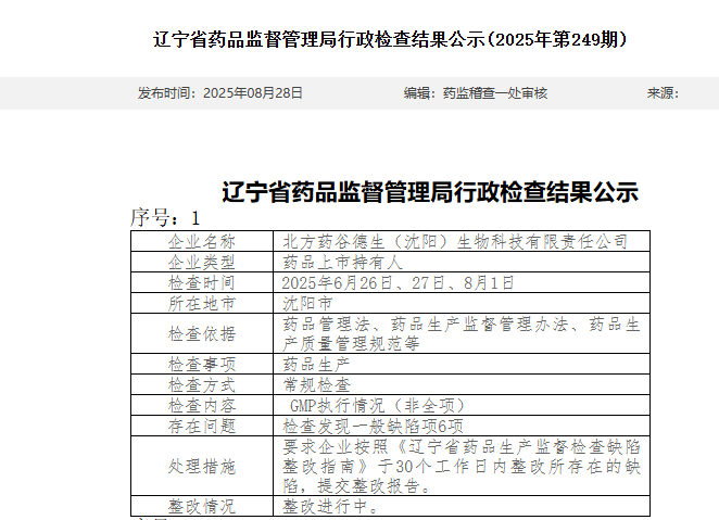 中國經濟網9月1日訊 日前,遼寧省藥品監督管理局公示多則行政檢查結果信息。其中,在對北方藥谷德生(沈陽)生物科技有限責任公司GMP執行情況檢查中,發現該公司存在一般缺陷項6項。對此,遼寧省藥品監督管理局要求該公司按照《遼寧省藥品生產監督檢查缺陷整改指南》于30個工作日內整改所存在的缺陷,提交整改報告。目前,該公司整改進行中。