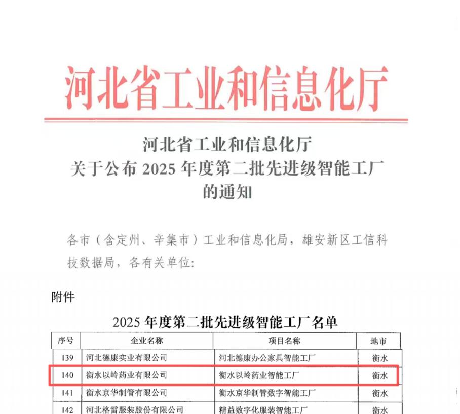 衡水以嶺藥業獲評河北省“先進級智能工廠”